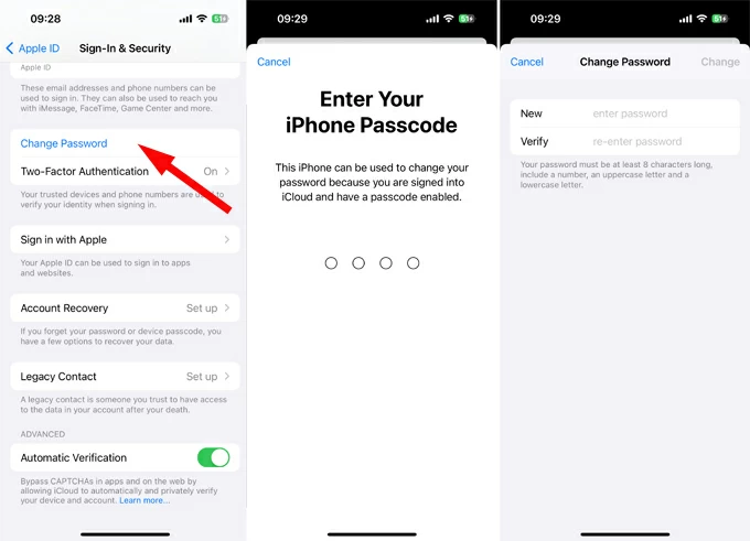 2. Tap [your name] at the top of the page, select Sign-in & Security, and then tap Change Password.