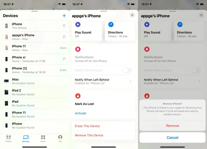 3. Tap Remove This Device, then tap Remove (available when the target device is not connected to the internet) to confirm.
