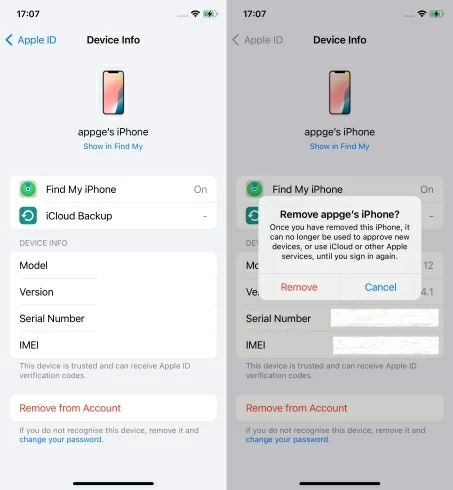 4. Click Remove from account, then click Remove to start removing the Apple account from that iPhone.