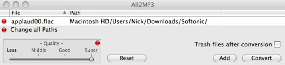 Just like its name explains: you can convert any music files on Mac, including FLAC, into MP3 format with All2MP3. It includes several bitrate options for tweaking sound quality, ranging from 32 to 320 Kbps/s. This totally free FLAC converter program uses AppleScripts.