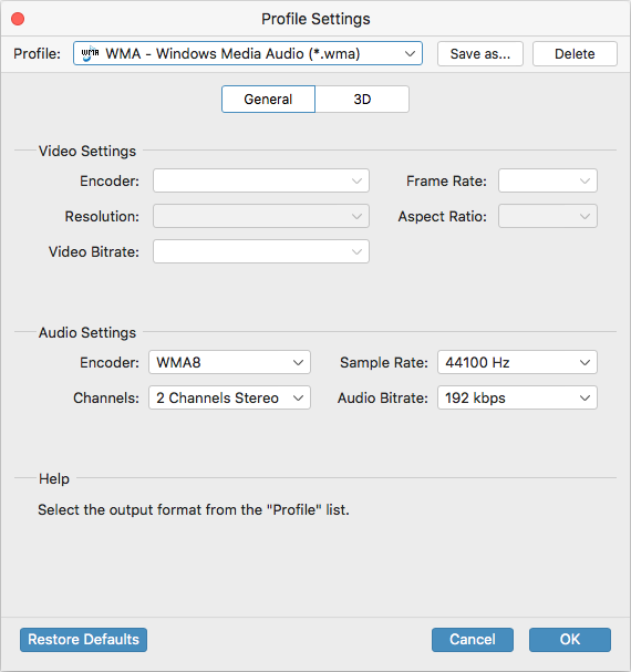 Next, click the Settings button on the bottom center of the main interface and a "Profile Settings" window comes into sight, showing the parameters for audios. You can take advantage of the tweaking capabilities to get the best possible result.