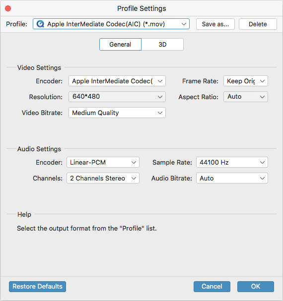 Once you decide on the format, all the codecs for video and audio track should automatically be configured with the default and best possible results, but if you may need to modify them manually, simply a click of the Settings button next to Profile menu to open the Profile Settings window.