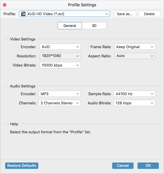 Next, click the "Settings" button next to "Profile" to get into the Profile Settings window. From there you set the value towards Video Codec to Xvid. Similarly, you can modify other parameters such as resolution, bit rate, frame rate if you know what you're doing.