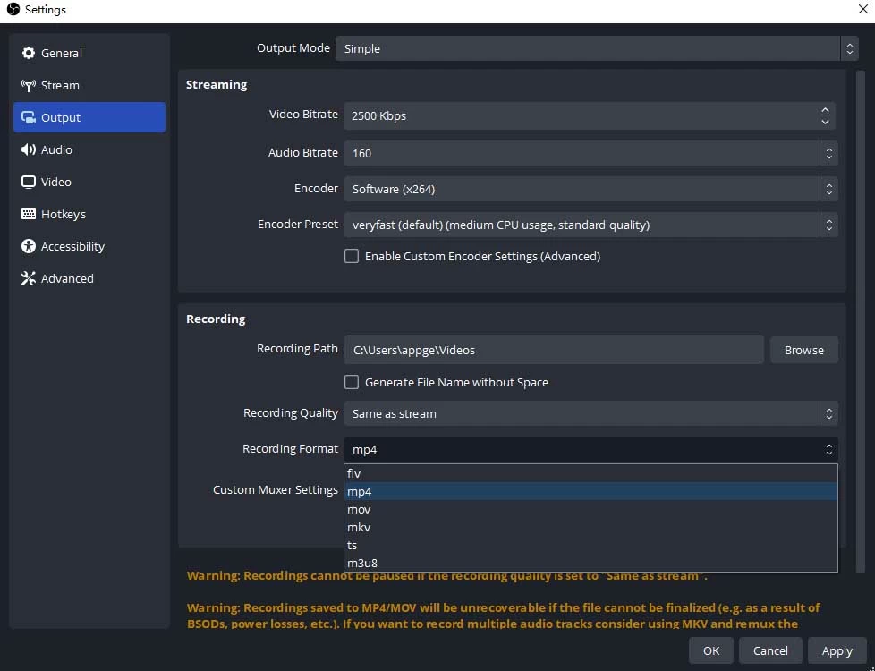 Advanced users who want to get the Discord recording with optimized audio effects can go to File > Settings > Output to tweak the parameters like audio bitrate.