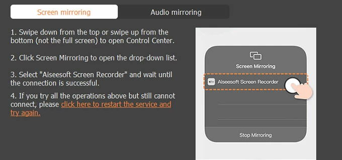 Step 5:Select Screen mirroring or Audio mirroring on the computer and tapping the corresponsive button on your iPhone by following the on-screen instruction to connect your iPhone with the Screen Recorder.