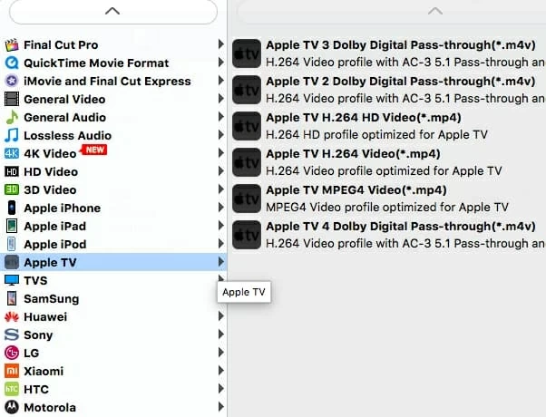 Alternatively, you can set a specific format under "Video" column as output file. According to Apple TV's tech specifications, it will read .m4v, .mp4, and .mov file formats with h.264 / mpeg-4 codec, or .avi file format with Motion JPEG (M-JPEG) codec. So here you are able to pick the correct file format as you like.