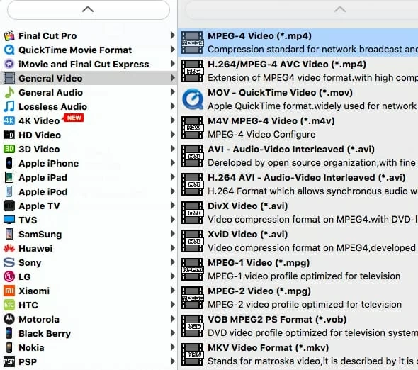 Next, move the eyes to the orange No.2 area, click on the "Profile" pull-down menu to open the output file panel (see below). Just select MPEG-4 Video (*.mp4) from the list of available formats under "General Video" category.
