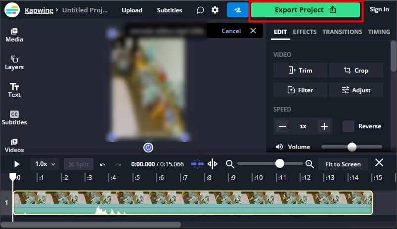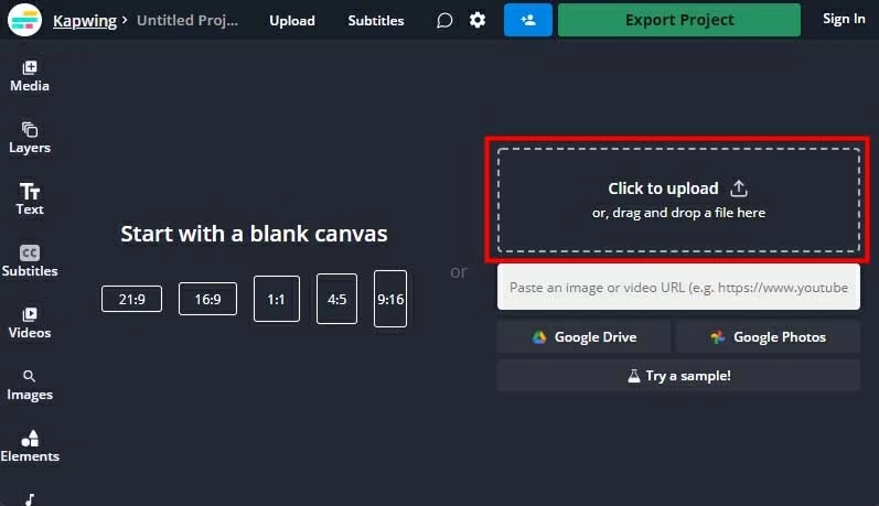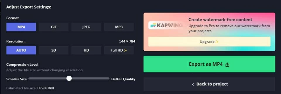 KapWing is an online video converter that helps you convert your AVI files into MP4 and vice versa fit for any platform. It also supports other formats such as 3GP, MOV, WEBM, GIF, and many others. You just need to upload the original AVI videos to the converter, select the output format as MP4, and run the converter to start the AVI to MP4 conversion. After then, click Export Project to save the MP4 video on your computer.
