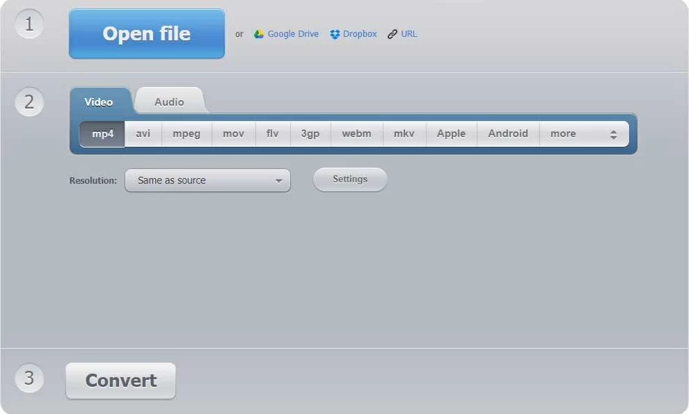 Step 1: Go to video-converter.com. Simply click Open file to import an AVI file from your device storage, google drive, or dropbox. Also, you can paste the file's URL to the address bar.