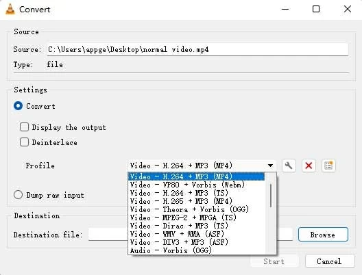 Step 4: Open the drop-down menu of Profile and choose Video - H.264 + MP3 (MP4). Then choose a save location for your new MP4 by clicking Browse at the bottom of the window. Later, Start the conversion process.