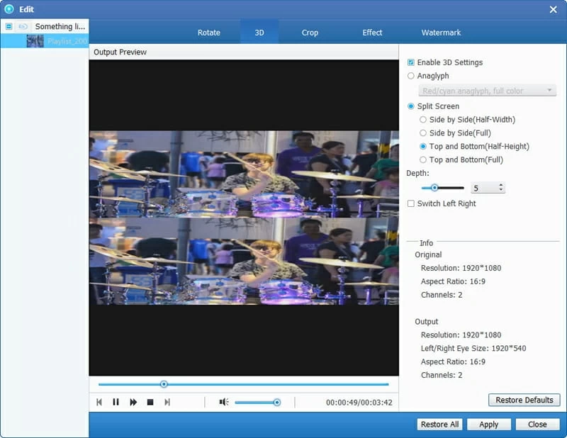 Open 3D tab, and tick "Enable 3D Settings" option. Then you could select 3D effect, adjust 3D Depth and get instant preview of 3D effect.