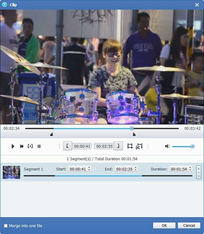 1. Click the Clip button on the top menu bar, you will get into a Clip window where you can trim video duration by setting start time and end time to keep the segment you want, or directly drag the slider to the exact point.