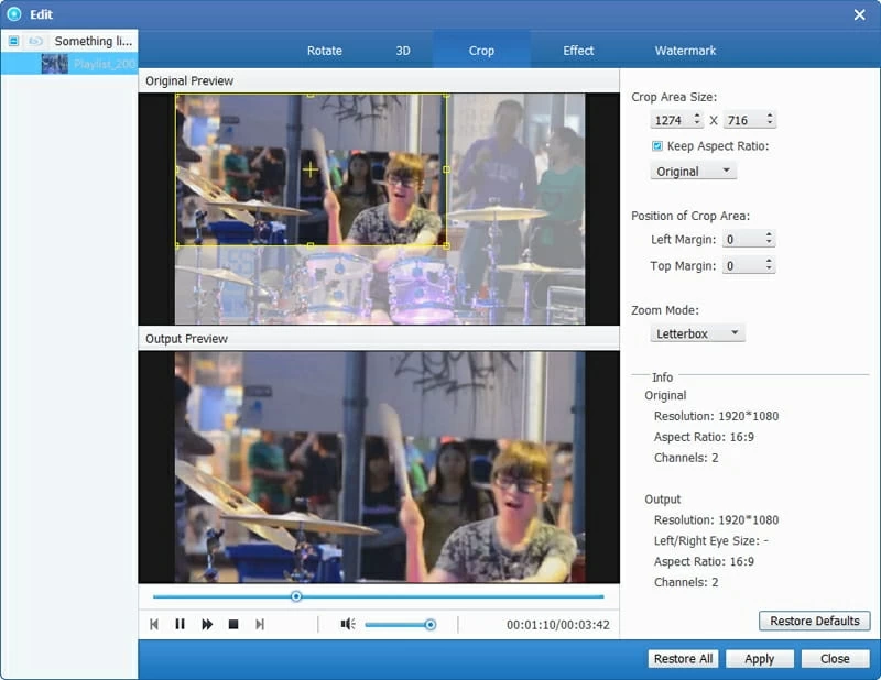 In Crop tab, set the "Left" and "Top" parameters, select a Zoom type, or adjust the dot frame to remove the back margins and unwanted parts on the video frame.