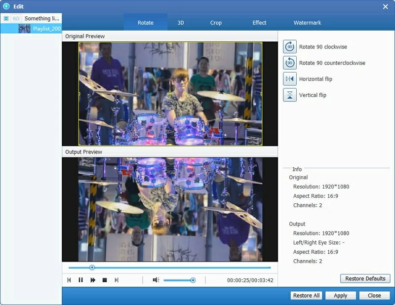In Rotate tab, revolve the video to the needed angle. You can achieve horizontal flip & vertical flip, or realize to rotate 90° clockwise and rotate 90° counterclockwise.