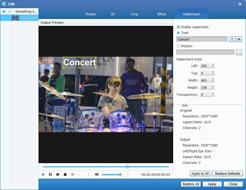 In Watermark tab, by ticking "Enable Watermark" option, you can add image or text watermark. You can also customize watermark parameters.