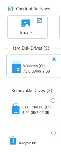 If you know the specific file types you need or at least part of it, check the box(es) next to file type separately in the list. If you are not sure then select all boxes. Note that this might display a huge number of files after scanning, and make it difficult to find the files you're looking for.