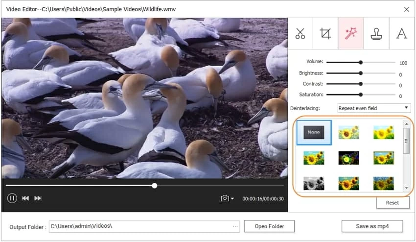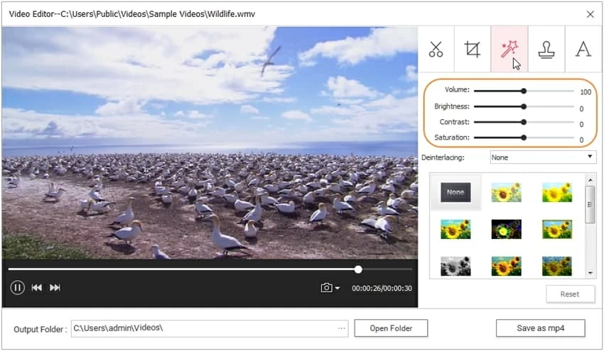 Switch to three effect icon to enhance your video by adjusting video Volume, Brightness, Contrast and Saturation.