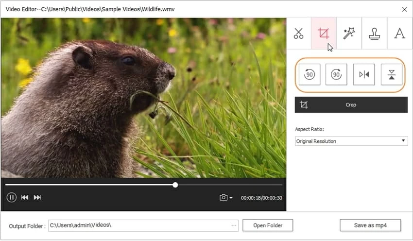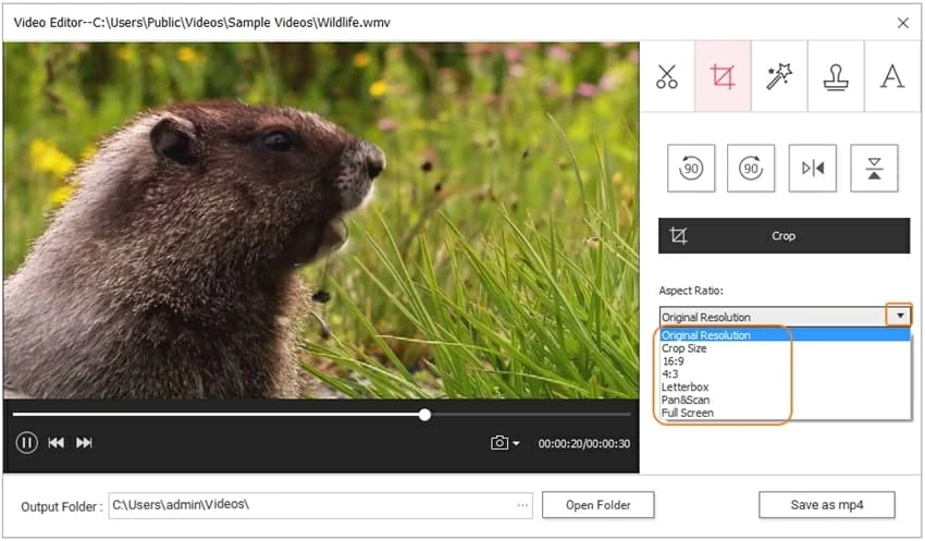 Change Aspect Ratio: In Aspect Ratio field, you can change the video aspect ratio. As you can see, you can keep Original Resolution, or change to Crop Size, Letterbox, Full Screen, etc.
