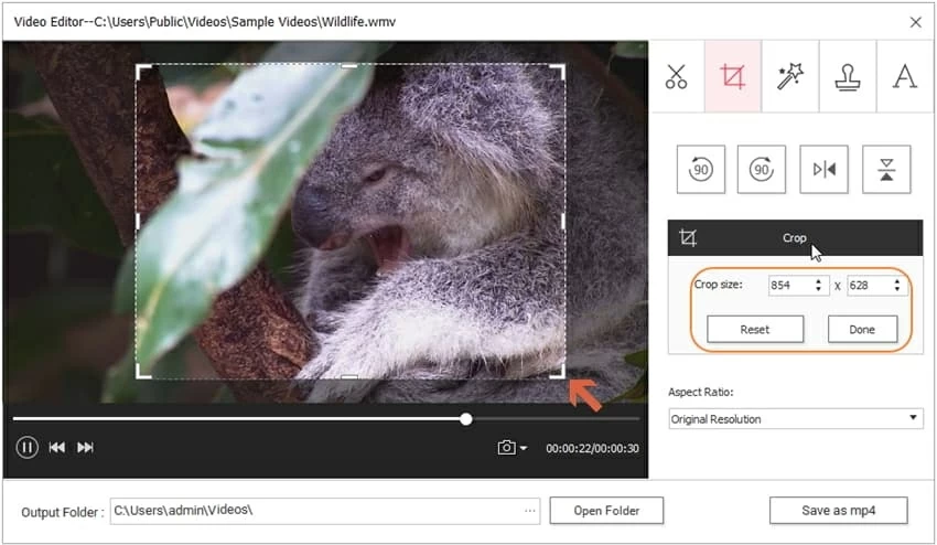 Adjust Crop Size: Hit the "Crop" button, you'd get the crop size box and crop area on the video simultaneously. Then you can freely edit the width and length in the crop size box, or drag the crop area to your preferred size.