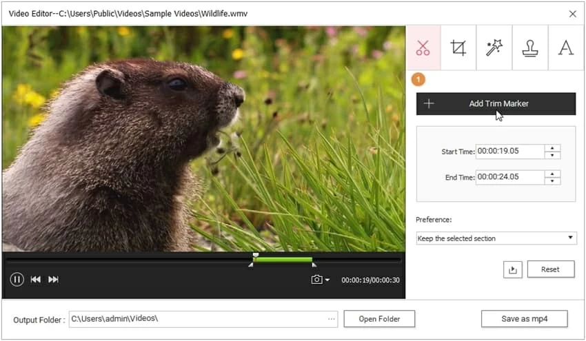 You'll see the specific Start Time and End Time for the selected video segment. The program cuts video in 5-second segment by default. If you want to adjust the video section, just enter the specific start/end time or directly drag the time slider in the video.