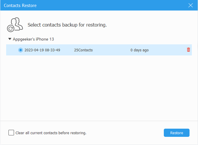 There is a "Clear all current contacts before restoring" option at the bottom, which lets you remove the existing contacts list on the phone so that you can get a complete copy of contacts from a backup without any duplicates.