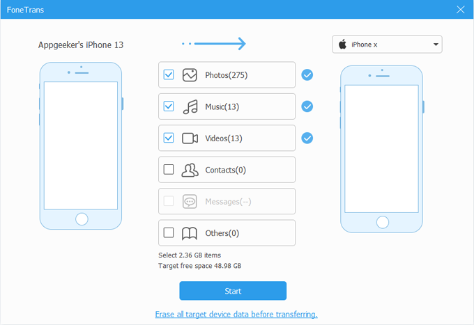 4. Optional. You may tick "Erase all target device data before transferring" option on the bottom center, which help you clear out the data on the desination device firstly before you make a transfer.