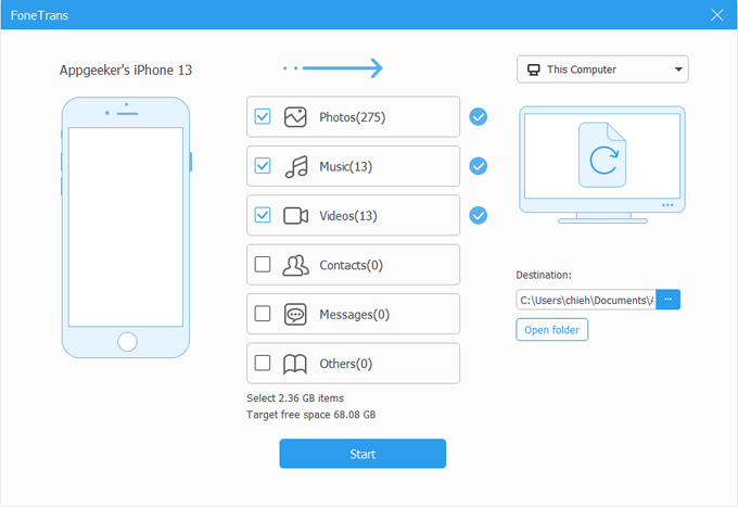 4. Click "Start" to begin transferring your selected files from your device to your either PC or Mac.
