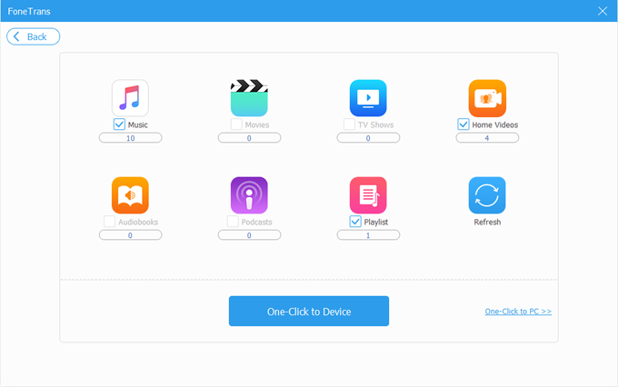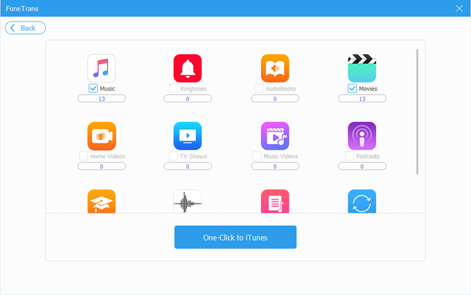 3. Select what data types you want to sync with iTunes from the scanned resulting list: Music, Ringones, Podcasts, Audiobooks, Videos, Home Videos, TV Shows, Music Videos, iTunes U, Voice Memo, Playlists.