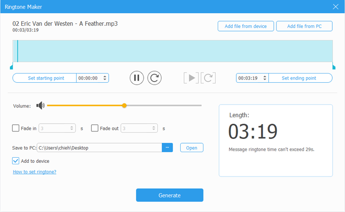3. After your music file is imported, in the editing window, set the starting time and ending time for the ringtone, adjust volume, and set when the sound fades in or/and fades out.