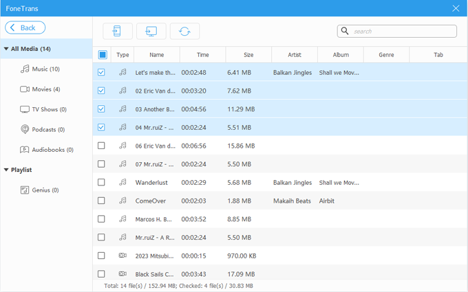 3. The program will start scanning contents included in your iTunes library and display the entire library on a new new window. By default, all scanned items will be checked, you can uncheck any of them and only select the ones you want to transfer.