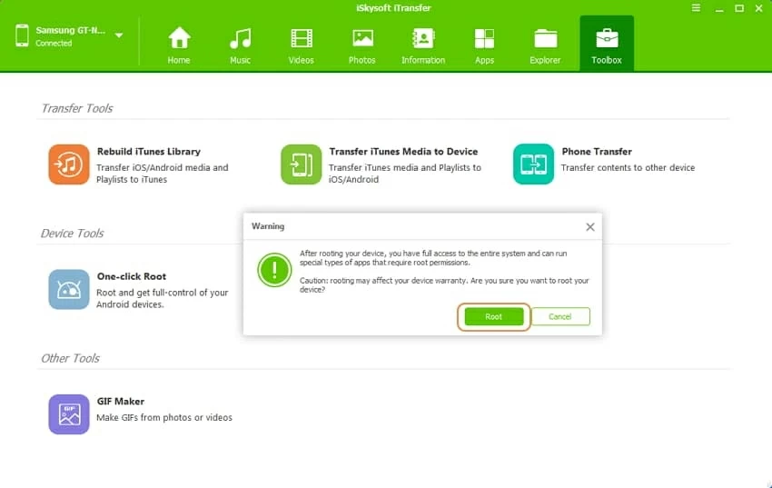 One-click to Root: this tool only works for Android devices, and it only comes up when you select an Android device from the upper left corner of the interface.