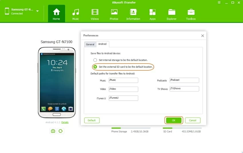 Switch to Android tab, check the radio icon next to Set the external SD card to be the default location under Save files in Android Device.