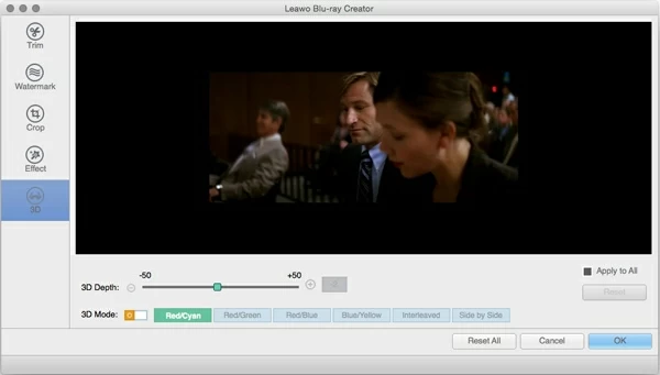 Add 3D DVD/BD: Click on the "3D" option then you will enter the 3D Setting section. Various 3D setting modes prepared for you: Red/Cyan, Red/Green, Red/Blue, Blue/Yellow, Interleaved, you can pick up one from which for video to 3D DVD or video to 3D BD creation. To set 3D Depth effect, you can directly drag the slider of 3D Depth or adjust the value in 3D Depth.