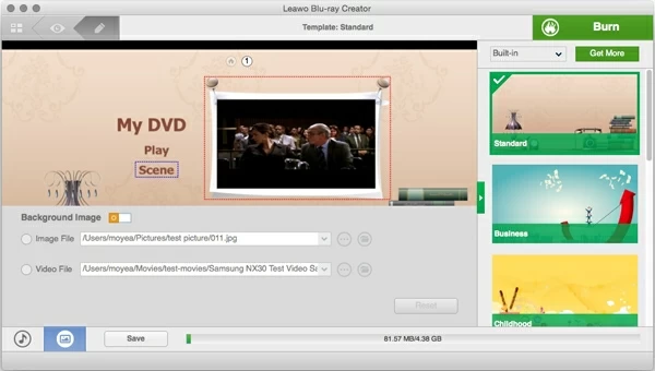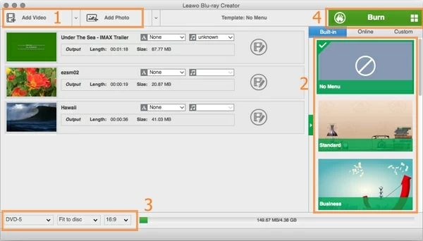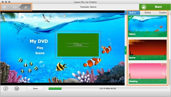 Choose a disc menu (2) on the right side of this Blu-ray Creator for output Blu-ray movies. You could select from preset models or custom disc menu as you like. You could preview selected disc menu, DIY disc menu and then click "Save Template" option to save custom disc menu into "Custom" group. Click "No Menu" option on the disc menu selecting panel if you need no disc menu.