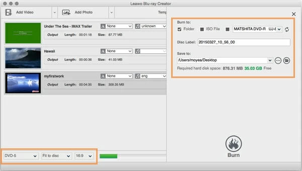 At the bottom of this interface, you can choose to burn to DVD-5/DVD-9/BD-25 1280X720/BD-25 1920X1080/BD-50 1280X720/BD-50 1920X1080, adjust the burning speed (fit to disc, 2/3/5/7/9 Mbps), and set aspect ratio as 4:3 or 16:9 (when burning to BD, only 16:9 is available).