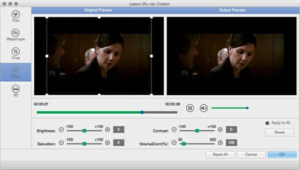 Effect: Click on "Effect" option then you are permitted to drag the sliders of Brightness, Contrast, Saturation and Volume Zoom to adjust video effect and Audio zoom.