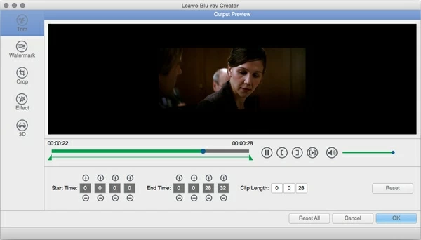 Trim: Click on "Trim" option then you can trim video by dragging the slider under video preview window or set value in Start Time and End Time. You will get the total Clip Length.