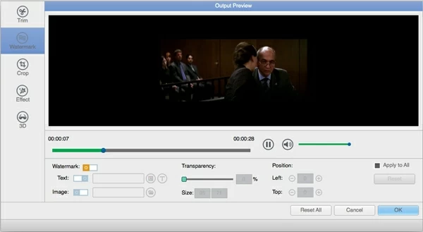 Watermark: Click on "Watermark" option then you are with ability to add image or text to the video as unique logo or brand.