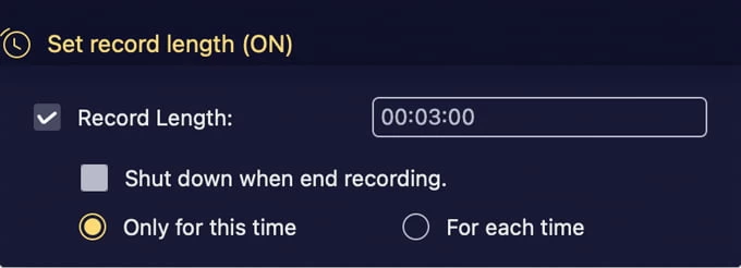 In the open window, set how long you want to record the video, and decide if it shuts down your computer after stopping recording. You can apply this setting to just this time, or for tasks.