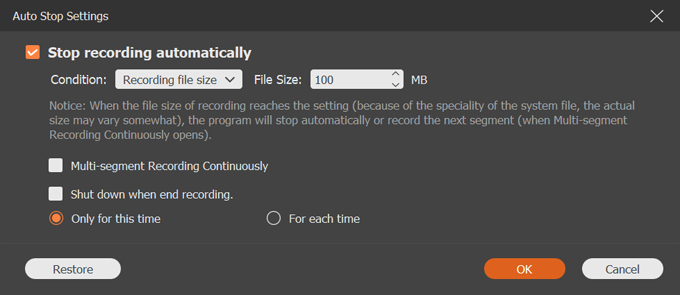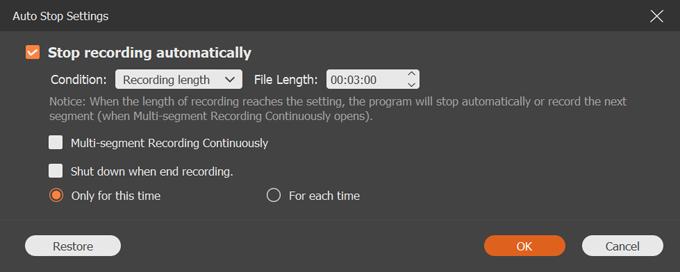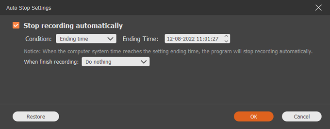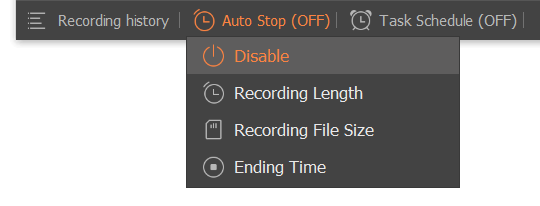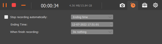 By clicking the Clock icon, you can enter recording schedule dialog. From there you can enable Stop Recording automatically option, and set your ending time, and the action you wish to perform after recording is finished.