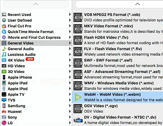 In our case, we need to convert from M4V to file with .webm extension, so here we go to the "General Video" column on the left pane and select "WebM - WebM Video (*.webm)" as output format from its expanding list on the right pane.