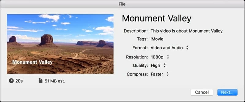 Note: By default iMovie will export movie as MP4 except you set "Quality" to Best Quality (pro res), which will render to a MOV file that is better for editing.