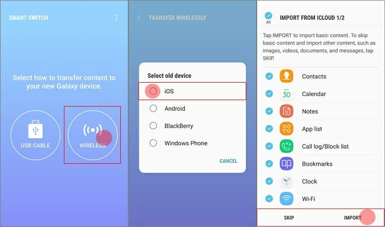 Samsung makes contacts transfer from iPhone to Samsung Galaxy phone easier than ever with its Smart Switch app via Wireless or using a USB OGT cable. For more in-depth information on Smart Switch and data migration, check out: Smart Switch - Transfer data from your old iOS device to your new Galaxy device. Here we take the wireless option for example.