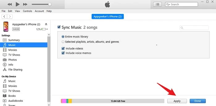 4. Once done, click Apply at the bottom. All the selected items will be synced to the iTunes.