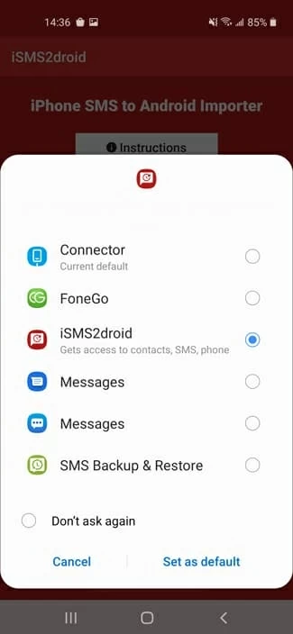 At this point, you will be prompted to temporarily change the default SMS app to iSMS2Droid. This will allow the app certain permissions to access photos, contacts, SMS and files and transfer them over.