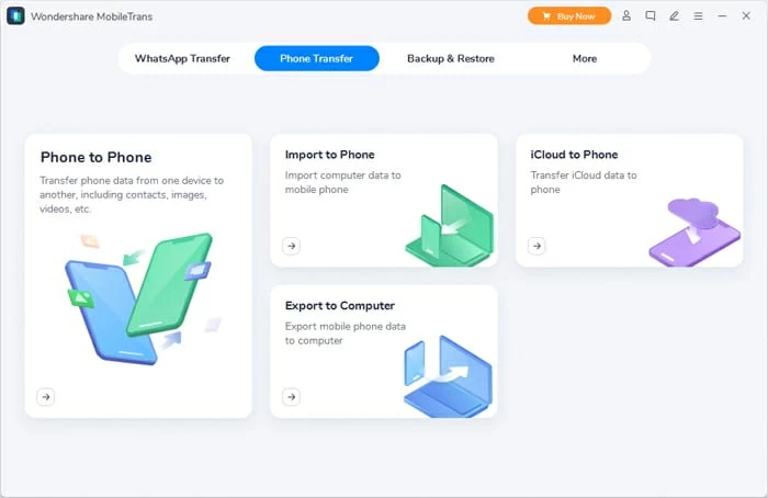 Step 1: Launch it from the desktop and choose Phone Transfer > Phone to Phone.