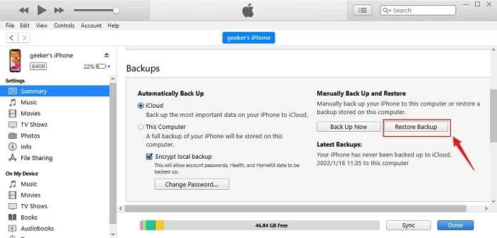 Here's another quick and easy method you can follow to transfer iPhone data using your computer, which is to restore your iPhone from iTunes or Finder where you've made a backup of your previous data recently.