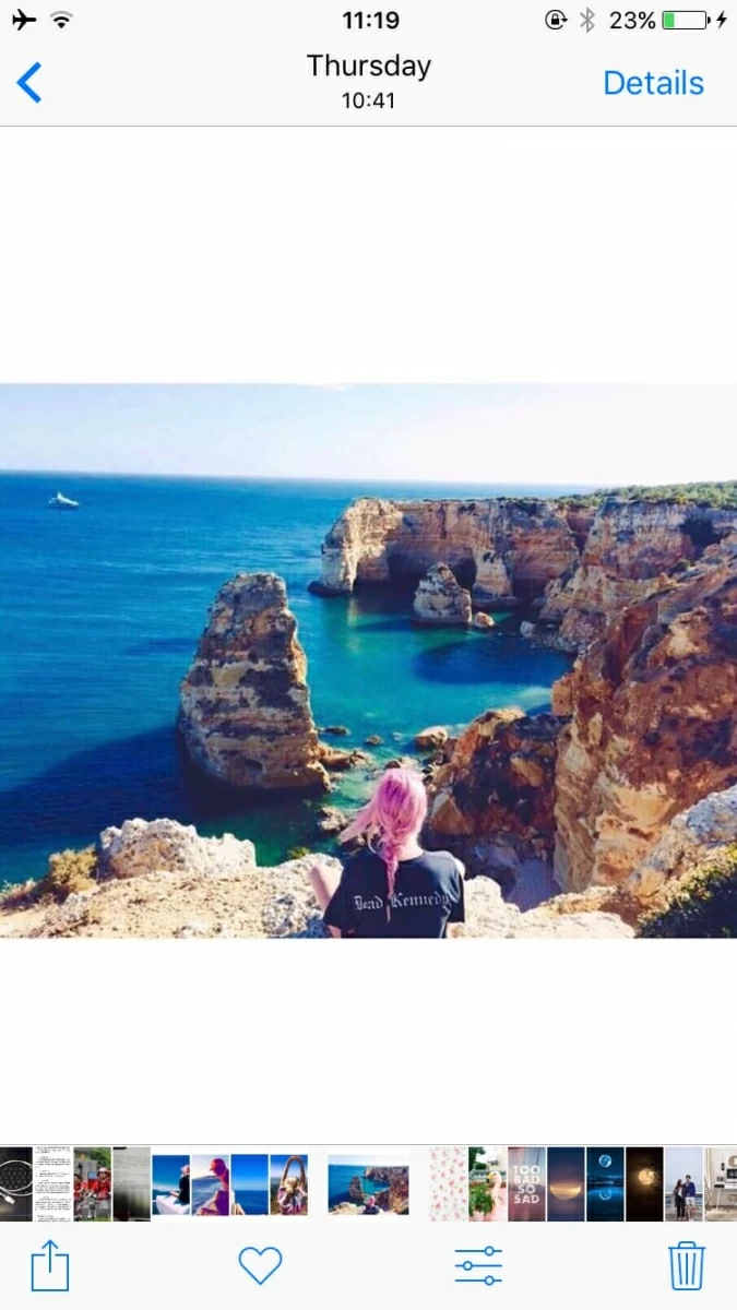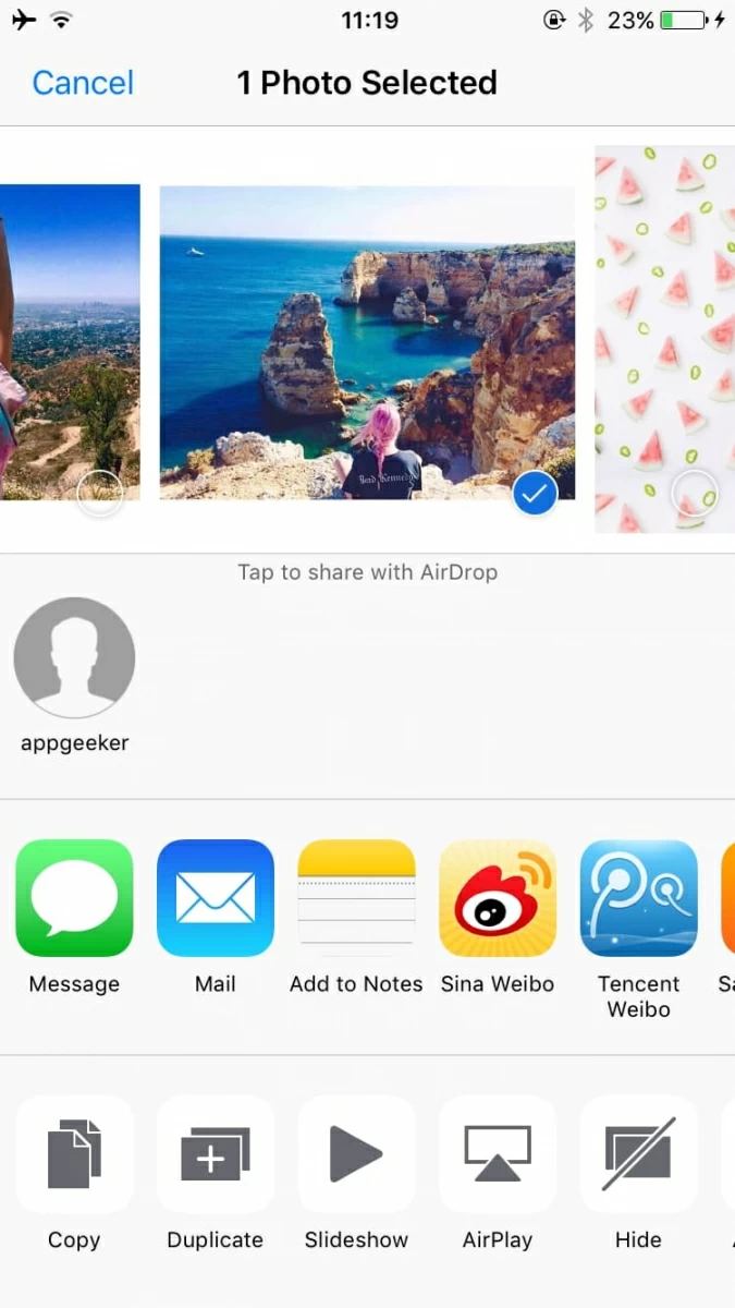 Go back to your iPhone, first select the photo (or any other content) you want to send to your Mac, and tap the share icon in the lower left side, which looks like a box with an arrow coming out of it, as the image shown below.