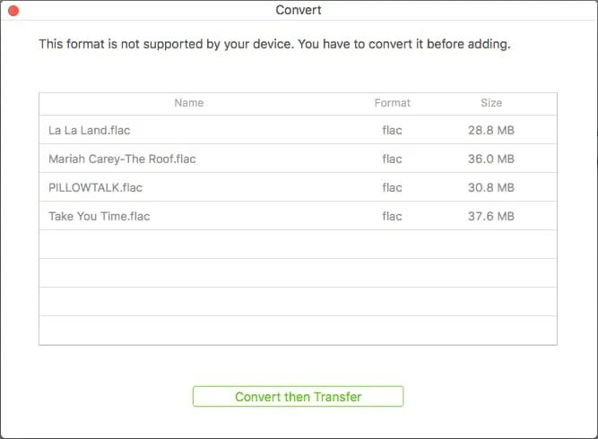 Tip 1: iPhone only supports MP3, AIFF, WAV, Apple Lossless (.m4a) and AAC audio files. If you're adding a list of non-iOS acceptable tracks like .ape, .flac to your iPhone, a message will comes up that says "this format is not supported by your device, you have to convert it before adding".