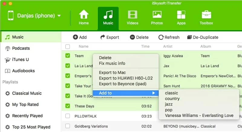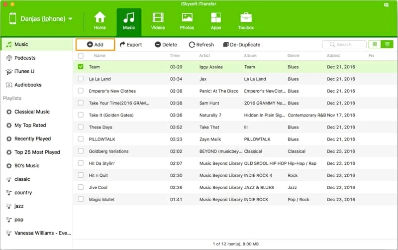 Tip 2: for those who would like to copy music from Mac to a playlist on iPhone, all you need to do is click on that playlist on the left side of the interface, then click the Add button on the top row to load songs from your computer.